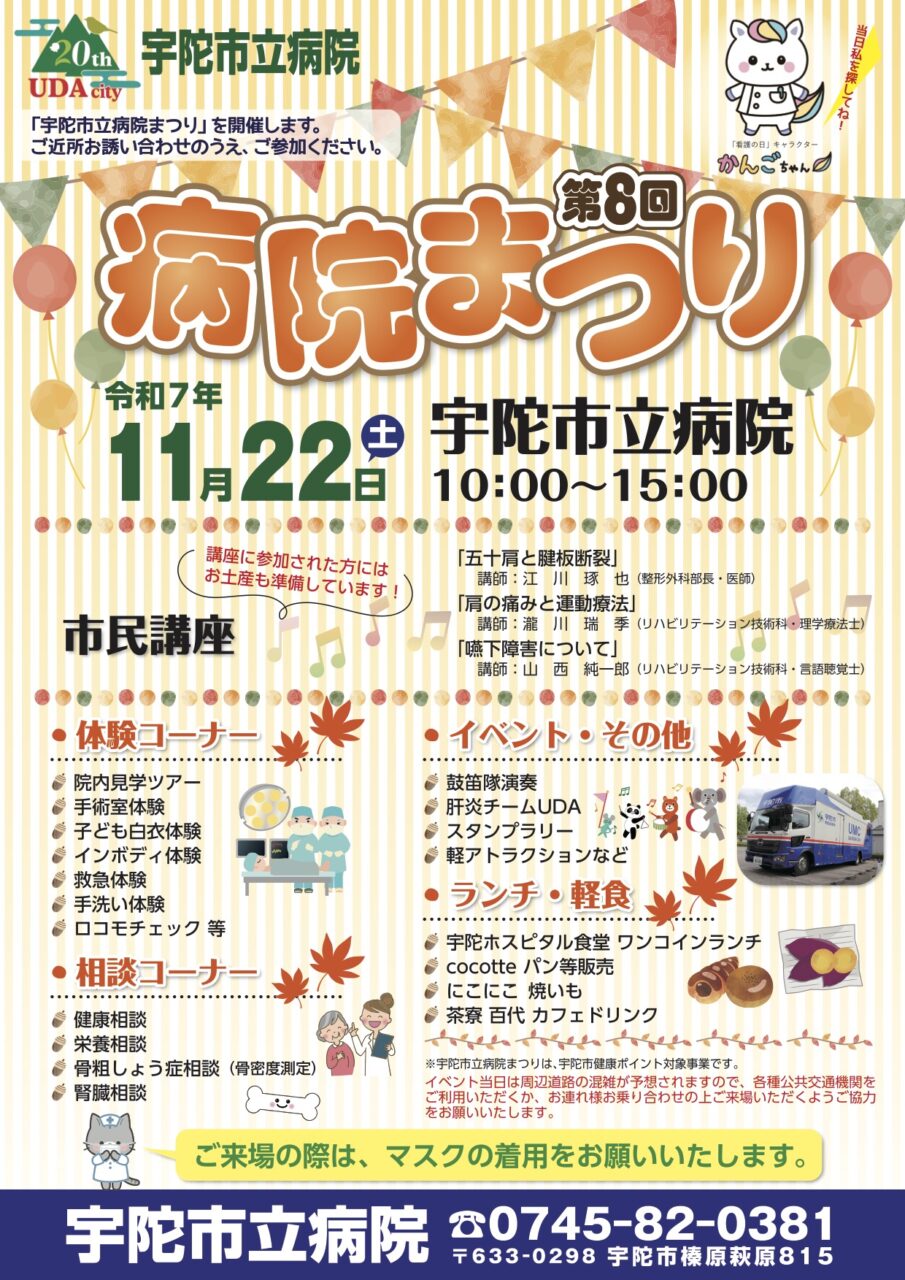 「第8回 病院まつり」開催! 2025.10.28 宇陀市立病院にて、病院まつりを開催いたします。親族や知人、ご近所の方も、お気軽にお誘いください。ご参加お待ちしております。 ●詳細は下記のチラシよりご確認ください。 flier_hospital-fes_2025ダウンロード 一覧へ戻る