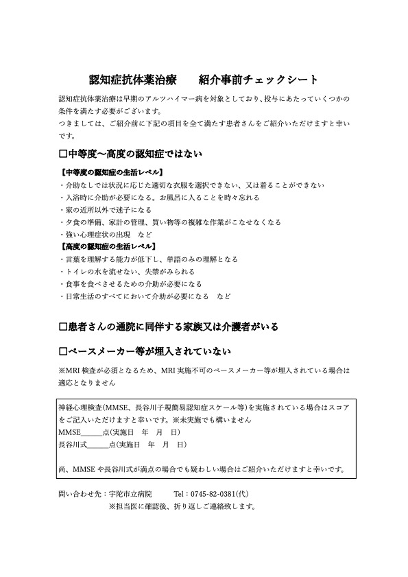 当院では、認知症専門医が奈良医大脳神経内科との連携により、当治療を受けていただく事が可能です。