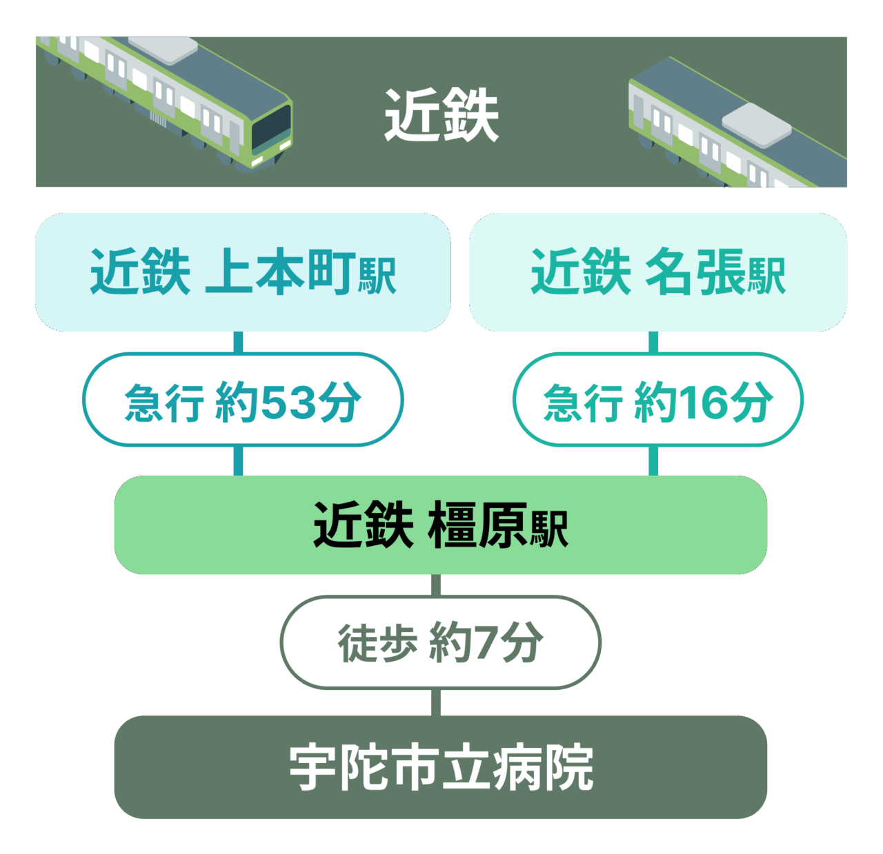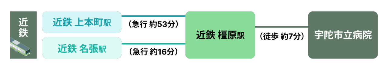 - 近鉄上本町駅(急行約53分)ー 近鉄榛原駅(徒歩約7分)ー 宇陀市立病院