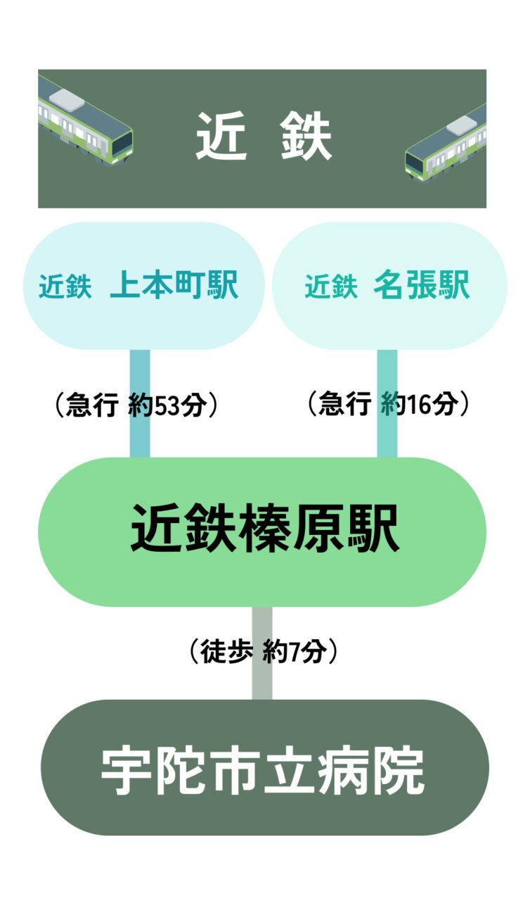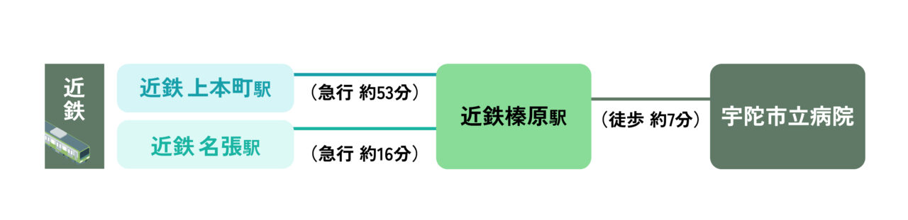 - 近鉄上本町駅(急行約53分)ー 近鉄榛原駅(徒歩約7分)ー 宇陀市立病院